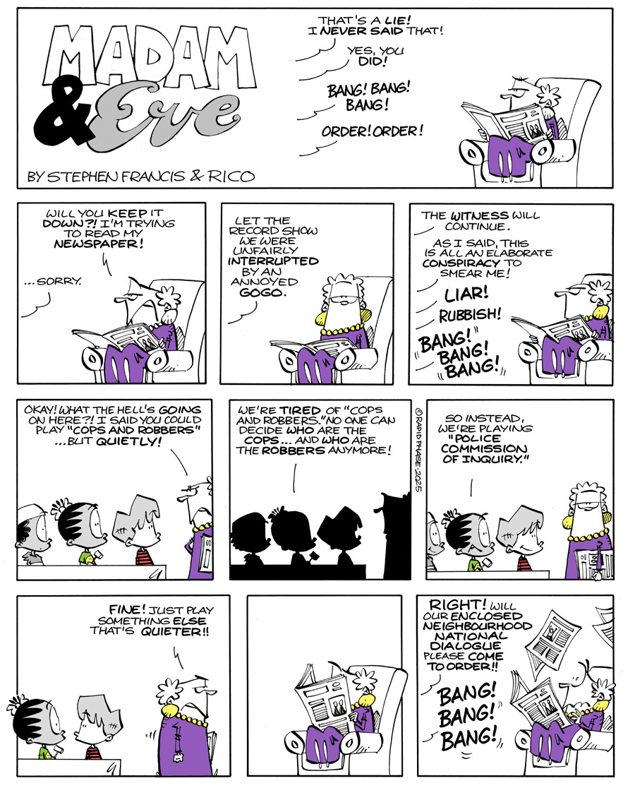 To read the weekly Daily Maverick cartoon, please scroll down to bottom of the page. The NEW Madam & Eve collection "UNMASKED" is now available at all good bookstore in South Africa or click HERE to order your copy online from Loot or click HERE to order your copy online from Takealot! Contact us here: Email: Rico Schacherl or Stephen Francis Phone: +27 82 330 4012